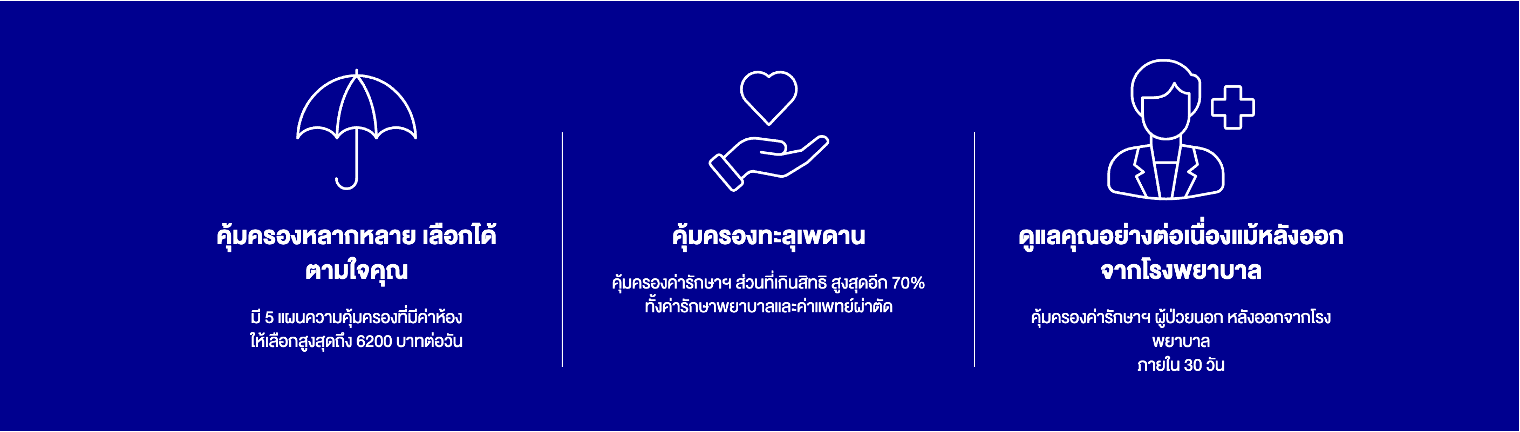 คุ้มค่าทุกวัย เบาใจค่ารักษา เริ่มต้นรับมือกับค่าใช้จ่ายเรื่องสุขภาพ ให้คุณและครอบครัวใช้ชีวิตได้อย่างหมดห่วงไร้กังวล ด้วยผลประโยชน์ค่ารักษาพยาบาลและค่าผ่าตัดผู้ป่วยใน