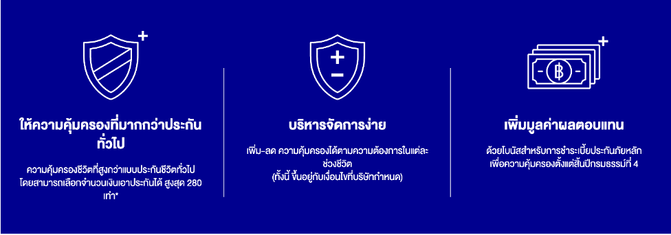 พลิกบทบาทครั้งสำคัญของแบบประกันชีวิตควบการลงทุนที่มากกว่าด้วยความคุ้มครองชีวิตที่โดดเด่นผสานความคุ้มครองที่หลากหลายด้านสุขภาพที่คุณเลือกได้ ด้วยความยืดหยุ่นของแบบประกันที่จะสามารถทำให้คุณเลือกหรือปรับเปลี่ยนความคุ้มครอง วางแผนทางการเงินได้ตามไลฟ์สไตล์ในแบบที่เป็นคุณ