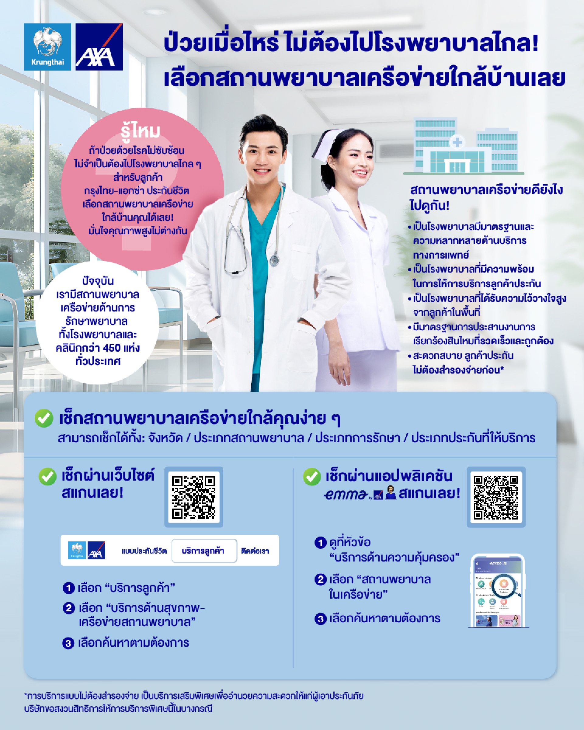ลูกค้ากรุงไทย-แอกซ่า ประกันชีวิต วันนี้สะดวกสบายได้อีกขั้น! กับเครือข่ายสถานพยาบาลคุณภาพ โลเคชั่นใกล้บ้านคุณ